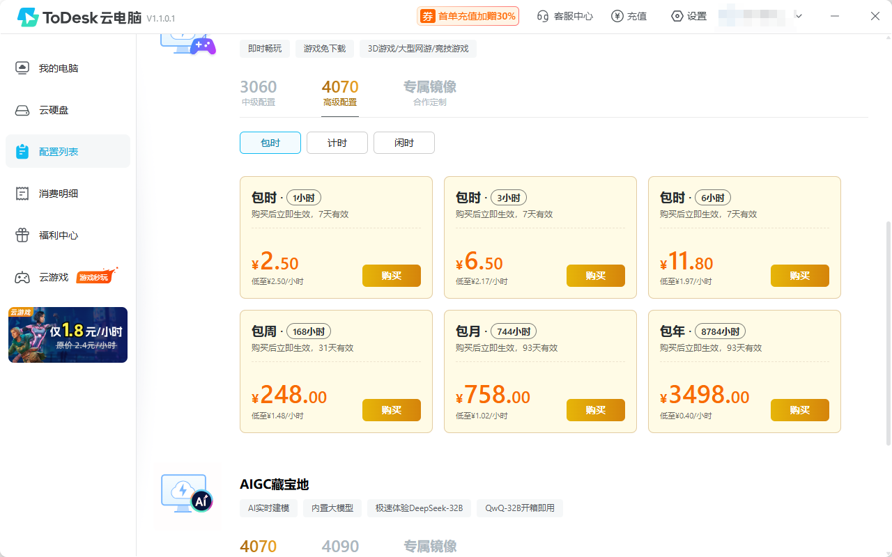 电脑的分为高性能云电竞、云设计、云AIGC这三种类别;如果是只针对某款游戏用是可以直接在云游戏中自由操作的,均很便捷灵活,成本单小时个位数也要划算的多,对于短期使用的用户来说更合适。