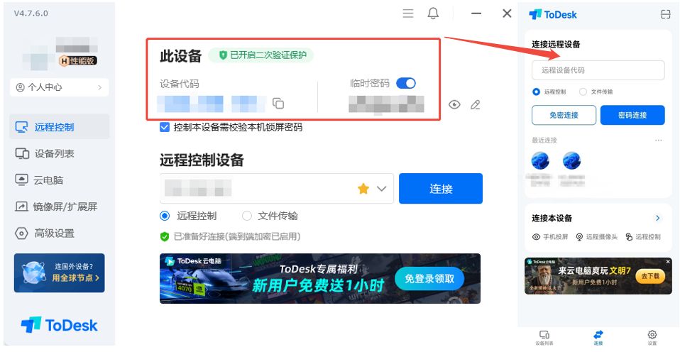 随后需要注册登录,然后依据界面提示进行操作。以手机远程连接公司的高配电脑为例,将PC端ToDesk中的设备代码和连接密码依次输入连接信息位置并完全确认即可。如果是远程协作的场景则更加方便些,如在家直接帮同事或甲方调整海报等啊,那么选择免密连接对方在设备前点击同意给确认会更快。