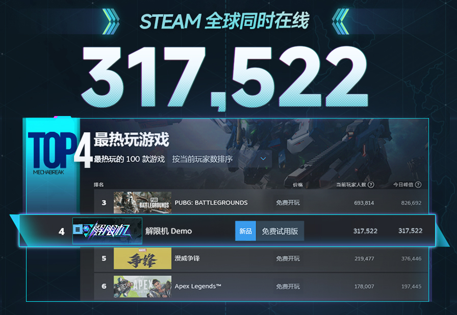 2025年2月23日,《解限机》开启全球测试。短短6小时后,这款国产游戏在Steam平台同时在线人数突破31.7万,一举冲上全球热玩榜第四位。测试期间,超过226万玩家涌入体验,200万人将其加入愿望单,Twitch首日观看时长27万小时,三天内登上该平台历史前八名。