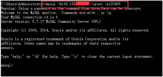 输入命令:mysql -hIP地址 -uroot -p123456