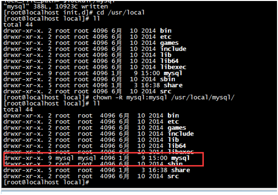 5、 给目录/usr/local/mysql 更改拥有者