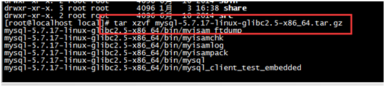输入命令:tar xzvf mysql-5.7.17-linux-glibc2.5-x86_64.tar.gz