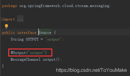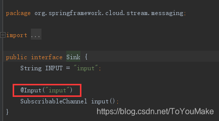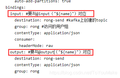 配置文件标红的是与下面注解的value所对应的,各位想要不同的名字的通道,大可定义这样的接口,接口不用实现,项目在部署阶段stream-kafka会检测这两个注解@Input@Output,自动为它们实现的。