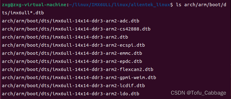 再次编译,编译完成以后就会在 arch/arm/boot 这个目录下生成一个叫做 zImage 的文件, zImage 就是我们要用的 Linux 镜像文件。另外也会在 arch/arm/boot/dts 下生成很多.dtb 文件,这些.dtb 就是设备树文件。我们需要的设备数文件是imx6ull-14x14-emmc-7-1024x600-c.dtb