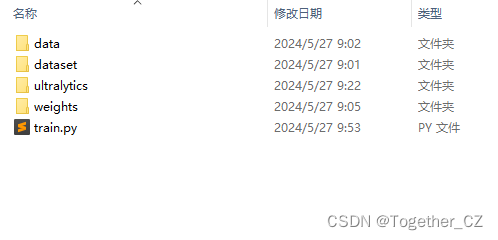 完成前述2部分的工作后就可以开始训练模型,前面我们讲过YOLOv10是基于YOLOv8项目构建的,所以整体的使用风格就是YOLOv8项目的使用方式,我们自己在项目同级目录下面创建train.py,内容如下: