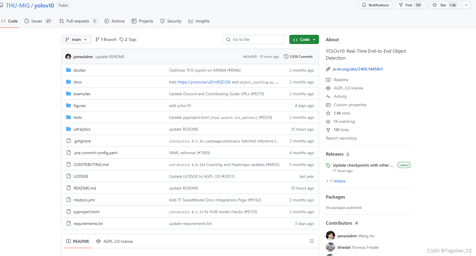 在官方的README里面,官方介绍了,YOLOv10主要是依托于YOLOv8项目和RT-DETR算法模型进行开发的,所以YOLOv10整体的项目使用与YOLOv8应该是没有太大区别的。