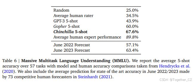 Massive Multitask Language Understanding(MMLU)基准测试(Hendrycks et al., 2020)包含一系列学术科目的考试式问题。在表6中,我们报告了Chinchilla在MMLU上的平均5-shot性能(完整结果分解见表A6)。在这个基准测试中,Chinchilla尽管比Gopher小得多,但显著优于Gopher,平均准确率为67.6%(比Gopher提高了7.6%)。值得注意的是,Chinchilla甚至超过了专家对2023年6月准确率为63.4%的预测(见表6,Steinhardt, 2021)。此外,Chinchilla在4个不同的任务上达到了超过90%的准确率——high_school_gov_and_politics、international_law、sociology和us_foreign_policy。据我们所知,没有其他模型在子集上达到过超过90%的准确率。