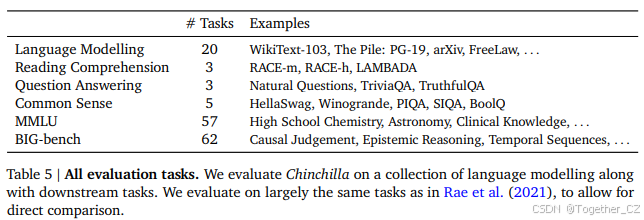 我们对Chinchilla进行了广泛的评估,并与各种大型语言模型进行了比较。我们在Rae et al. (2021)中提出的大部分任务上进行了评估,如表5所示。由于本工作的重点是模型的最佳扩展,我们包含了一个具有代表性的子集,并引入了一些新的评估,以便更好地与其他现有大型模型进行比较。所有任务的评估细节与Rae et al. (2021)中描述的相同。