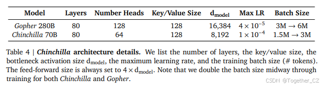 训练Chinchilla所使用的完整超参数集在表4中给出。Chinchilla使用与Gopher相同的模型架构和训练设置,除了以下列出的差异: