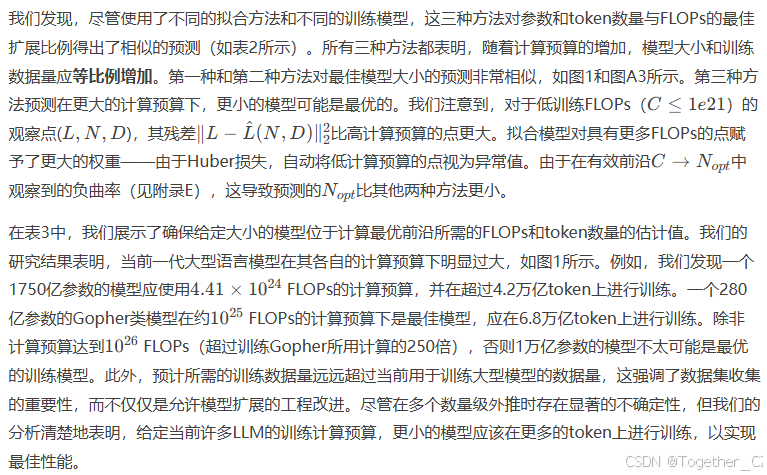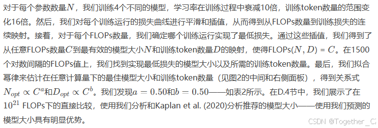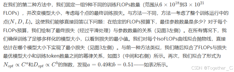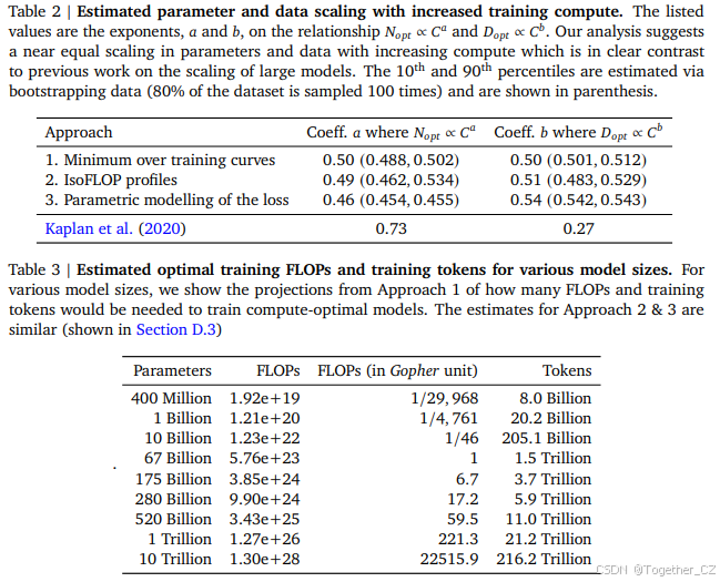我们提出了三种不同的方法来回答我们的研究问题:在固定的FLOP预算下,如何权衡模型大小和训练token数量? 在所有三种情况下,我们首先训练一系列模型,改变模型大小和训练token数量,并使用得到的训练曲线来拟合一个经验估计器,以估计它们应该如何扩展。我们假设计算和模型大小之间存在幂律关系,如Clark et al. (2022); Kaplan et al. (2020) 所做的那样,尽管未来的工作可能希望包括大模型大小的潜在曲率。所有三种方法的结果预测相似,并建议随着计算增加,参数数量和训练token数量应等比例增加——比例见表2。这与之前关于该主题的工作形成鲜明对比,值得进一步研究。