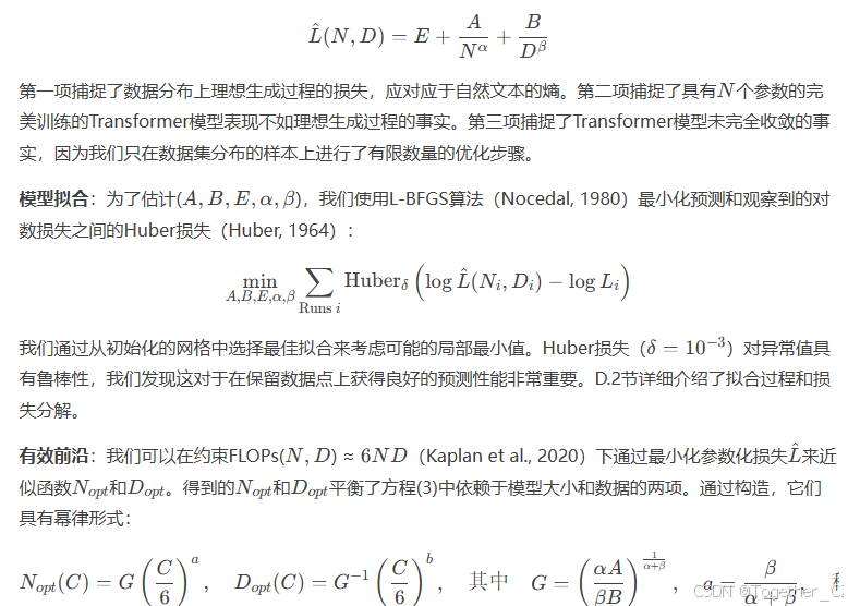 最后,我们将方法一和方法二实验中的所有最终损失建模为模型参数数量和训练token数量的参数化函数。遵循经典的风险分解(见D.2节),我们提出了以下函数形式: