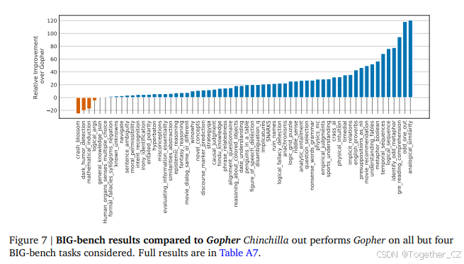 我们在Rae et al. (2021)中报告的相同BIG-bench任务集(BIG-bench collaboration, 2021)上分析了Chinchilla。与我们在MMLU中观察到的类似,Chinchilla在绝大多数任务上优于Gopher(见图7)。我们发现Chinchilla将平均性能提高了10.7%,达到了65.1%的准确率,而Gopher为54.4%。在我们考虑的62个任务中,Chinchilla仅在四个任务上表现不如Gopher——crash_blossom、dark_humor_detection、mathematical_induction和logical_args。Chinchilla的完整准确率结果见表A7。
