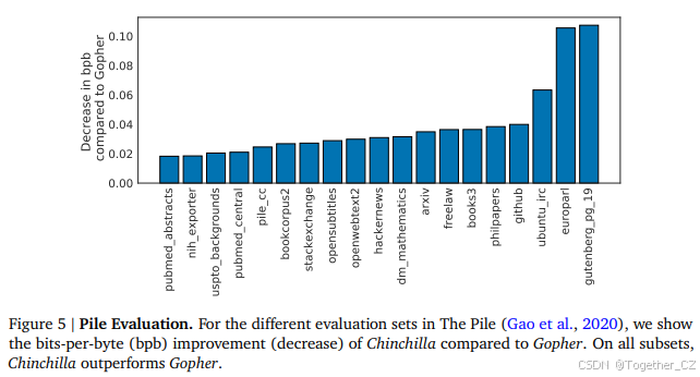 Chinchilla在The Pile(Gao et al., 2020)的所有评估子集上显著优于Gopher,如图5所示。与Jurassic-1(1780亿参数,Lieber et al., 2021)相比,Chinchilla在所有子集上表现更好,除了两个子集——dm_mathematics和ubuntu_irc——原始比特每字节比较见表A5。在Wikitext103(Merity et al., 2017)上,Chinchilla的困惑度为7.16,而Gopher为7.75。在比较Chinchilla和Gopher在这些语言建模基准上的表现时需要谨慎,因为Chinchilla训练的数据量是Gopher的4倍,因此训练/测试集的泄漏可能会人为地提高结果。因此,我们更关注泄漏问题较少的其他任务,如MMLU(Hendrycks et al., 2020)和BIG-bench(BIG-bench collaboration, 2021),以及各种闭卷问答和常识分析。