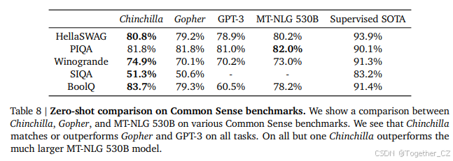 我们在各种常识基准上评估了Chinchilla:PIQA(Bisk et al., 2020)、SIQA(Sap et al., 2019)、Winogrande(Sakaguchi et al., 2020)、HellaSwag(Zellers et al., 2019)和BoolQ(Clark et al., 2019)。我们发现Chinchilla在所有任务上均优于Gopher和GPT-3,并且在除一个任务外的所有任务上优于MT-NLG 530B——见表8。