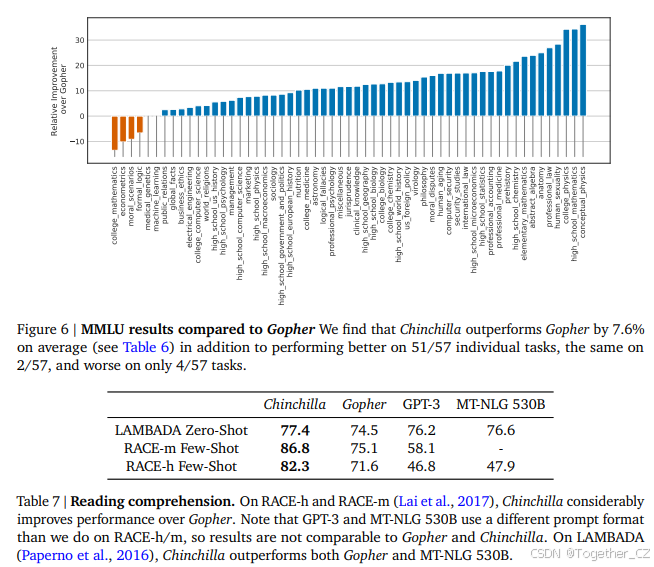 在最终词预测数据集LAMBADA(Paperno et al., 2016)上,Chinchilla达到了77.4%的准确率,而Gopher为74.5%,MT-NLG 530B为76.6%(见表7)。在RACE-h和RACE-m(Lai et al., 2017)上,Chinchilla大大优于Gopher,准确率提高了10%以上——见表7。