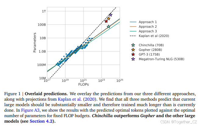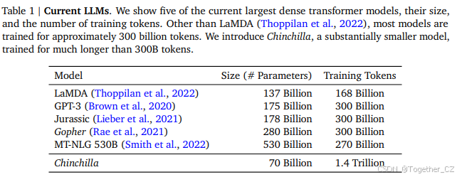 到目前为止,大型语言模型训练的趋势是增加模型大小,通常不增加训练token数量。最大的密集Transformer模型MT-NLG 530B现在比两年前的GPT-3的1700亿参数大了3倍以上。然而,该模型以及大多数现有的大型模型都训练了大约3000亿token。虽然训练这些巨型模型的愿望导致了大量的工程创新,但我们假设,训练越来越大的模型的竞赛导致模型的表现远远低于使用相同计算预算可以实现的表现。