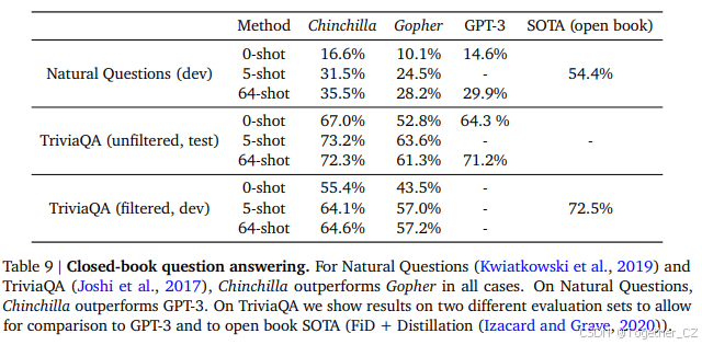 闭卷问答基准测试的结果见表9。在Natural Questions数据集(Kwiatkowski et al., 2019)上,Chinchilla达到了新的闭卷SOTA准确率:5-shot为31.5%,64-shot为35.5%,而Gopher分别为21%和28%。在TriviaQA(Joshi et al., 2017)上,我们展示了过滤版本(之前用于检索和开卷工作)和未过滤版本(之前用于大型语言模型评估)的结果。在这两种情况下,Chinchilla都大大优于Gopher。在过滤版本上,Chinchilla仅落后于开卷SOTA(Izacard and Grave, 2020)7.9%。在未过滤集上,Chinchilla优于GPT-3——见表9。