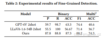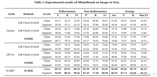 幻觉检测:表1和表2报告了在幻觉检测基准上的主要实验结果。我们可以得出以下结论。首先,在MHaluBench上,我们的检测模型(Hallucination DElectoR, H-DER)在平均上取得了最先进的结果,超越了GPT-4V和Gemini。具体来说,在声明级别上,我们的检测模型在Mac. F1分数上超越了UNIHD 4.7%,在Mac. F1分数上超越了GPT-4V Self-Check 2-shot 8.1%。在片段级别上的改进与声明级别一致。其次,在我们构建的细粒度检测数据集上,我们的检测模型在二元分类中取得了88.2%的F1分数,在细粒度分类中取得了74.3%的准确率,超越了GPT-4V 2-shot和LLaVA-1.6-34b 2-shot。