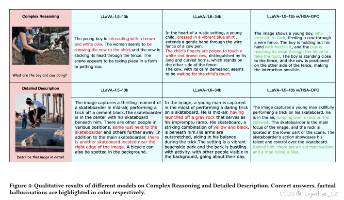 图4:不同模型在复杂推理和详细描述任务上的定性结果。 正确答案和事实幻觉分别用颜色高亮标注。
