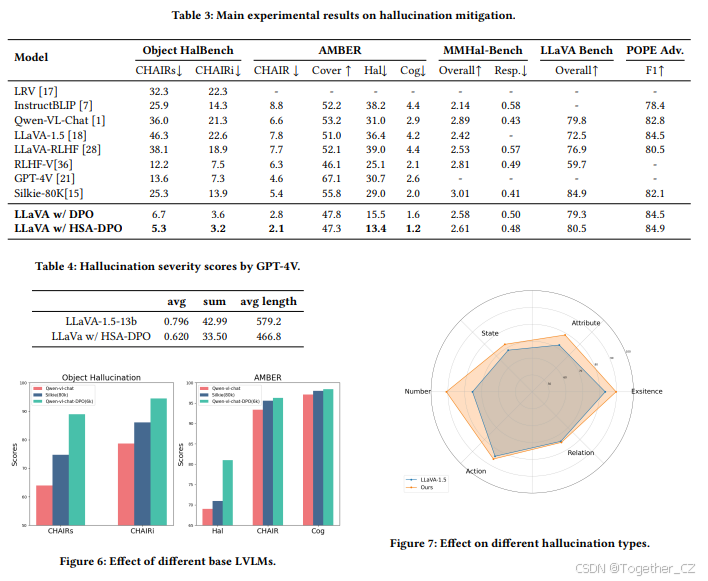 对不同幻觉类型的影响:为了评估我们的方法对不同幻觉类型(例如,对象、属性和关系)的影响,我们在Amber基准上进行了实验,并报告了不同幻觉类型的F1分数。如图7所示,HSA-DPO在LLaVA-1.5上在所有六种幻觉类型上均优于LLaVA-1.5。