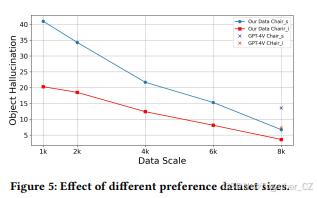 偏好数据集大小的影响:我们进行了实验,研究了不同偏好数据集大小对Object HalBench的影响。如图5所示,我们观察到随着偏好数据集大小的增加,HSA-DPO的幻觉率下降,这证明了我们管道的重要性,因为它能够以更低的成本标注偏好数据集。此外,当训练数据集大小达到8k时,我们的模型在CHAIRs和CHAIRi上均超越了GPT-4V。
