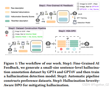 **步骤3:幻觉严重程度感知的直接偏好优化(HSA-DPO)**用于缓解幻觉。