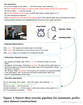 检测-重写管道:自动构建偏好数据集,通过检测模型识别幻觉,并由重写模型生成非幻觉响应。