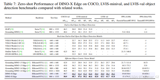 零样本目标检测基准评估:为了评估 DINO-X Edge 的零样本目标检测能力,我们在 COCO 和 LVIS 基准上进行了测试,并在 Grounding-100M 上进行了预训练。如表 7 所示,DINO-X Edge 在 COCO 基准上大幅超过了现有的实时开放集检测器。DINO-X Edge 在 LVIS-minival 和 LVIS-val 上分别取得了 48.3 AP 和 42.0 AP,展示了其在长尾检测场景中的出色零样本检测能力。