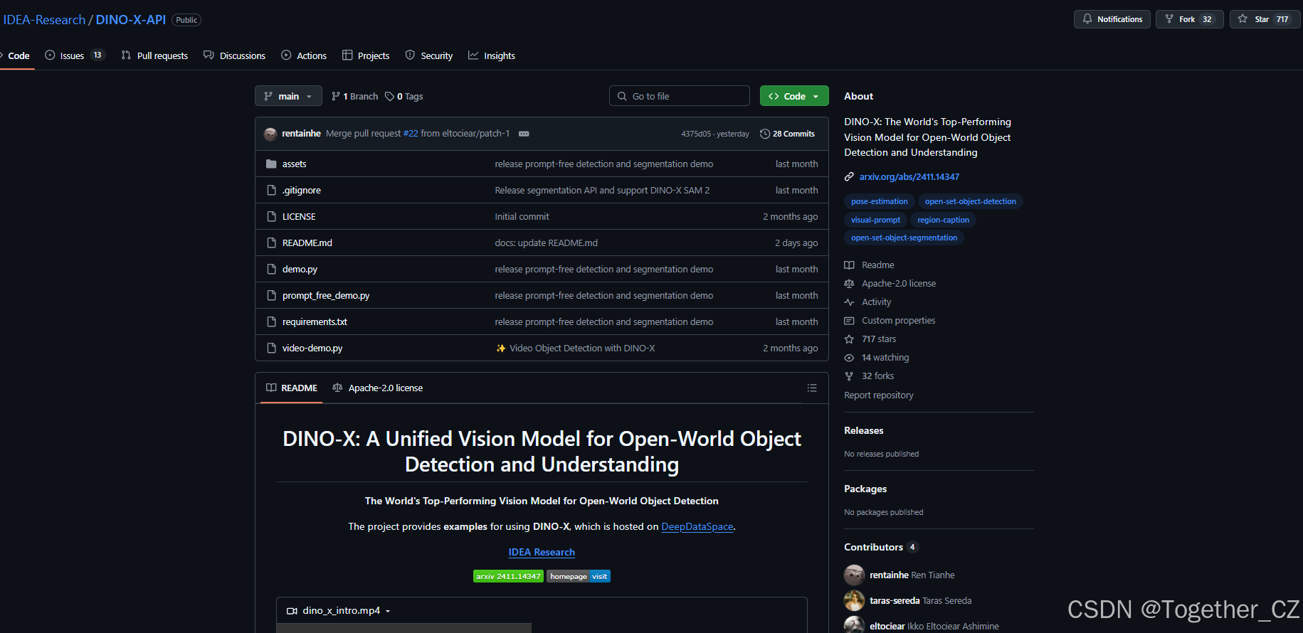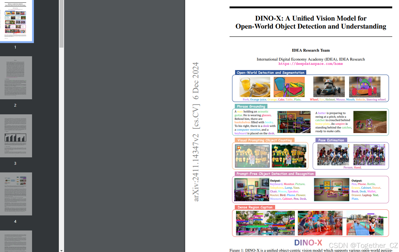 DINO-X 是一个功能强大且灵活的视觉模型,能够处理多种开放世界目标检测和理解任务,并在多个基准测试中取得了最先进的性能。这里是自己的论文阅读记录,感兴趣的话可以参考一下,如果需要阅读原文的话可以看这里,如下所示: