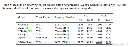 目标识别评估:我们在目标识别基准上验证了语言头的有效性,这些基准需要识别图像中指定区域的对象的类别。与 Osprey [73] 类似,我们使用语义相似度 (SS) 和语义 IoU (S-IOU) [8] 来评估语言头在目标级 LVIS-val [14] 和部分级 PACO-val [44] 数据集上的目标识别能力。如表 5 所示,我们的模型在 LVIS-val 数据集上达到了 71.25% 的 SS 和 41.15% 的 S-IoU,分别超过了 Osprey 6.01% 的 SS 和 2.06% 的 S-IoU。在 PACO 数据集上,我们的模型表现不如 Osprey。请注意,我们没有在语言头训练中包含 LVIS 和 PACO,并且我们的模型的性能是在零样本情况下实现的。在 PACO 上的较低性能可能是由于我们的训练数据与 PACO 之间的差异。此外,我们的模型只有 1% 的可训练参数,而 Osprey 则有更多。