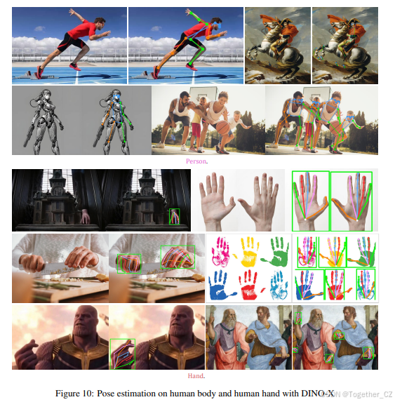 如图 10 所示,DINO-X 可以通过关键点头根据文本提示预测特定类别的关键点。通过在 COCO、CrowdHuman 和 Human-Art 数据集上的训练,DINO-X 能够预测各种场景中的人体和手部关键点。