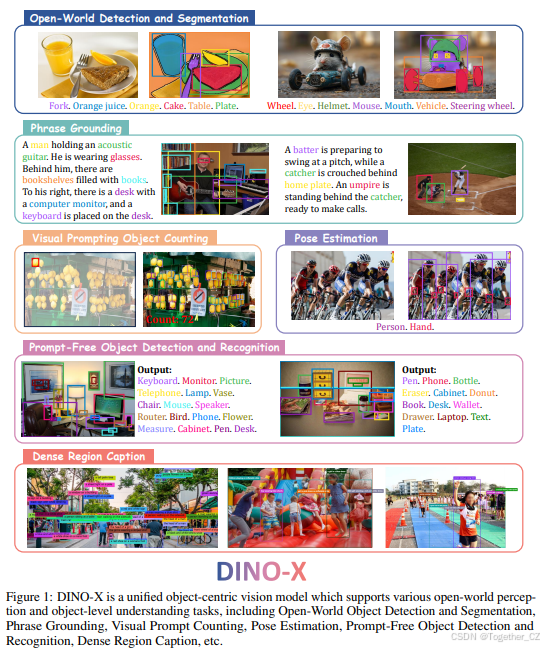 图 1: DINO-X 是一个统一的以目标为中心的视觉模型,支持多种开放世界感知和目标级理解任务,包括开放世界目标检测与分割、短语定位、视觉提示计数、姿态估计、无提示目标检测与识别、密集区域描述等。