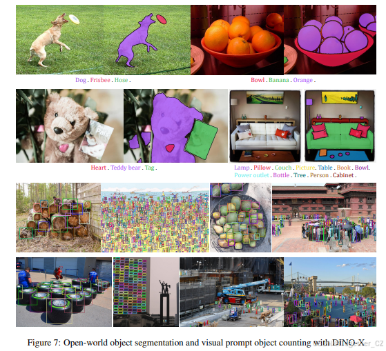 如图 7 所示,除了 Grounding DINO 1.5 [47],DINO-X 不仅支持基于文本提示的开放世界目标检测,还为每个目标生成相应的分割掩码,提供更丰富的语义输出。此外,DINO-X 还支持基于用户定义的视觉提示的检测,通过在目标对象上绘制边界框或点来实现。此功能在目标计数场景中展示了卓越的可用性。