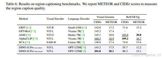 区域描述评估:我们在 Visual Genome [25] 和 RefCOCOg [37] 上评估了我们模型的区域描述质量。评估结果如表 6 所示。值得注意的是,基于冻结的 DINO-X 骨干提取的目标级特征,并且没有使用任何 Visual Genome 训练数据,我们的模型在 Visual Genome 基准上以零样本方式取得了 142.1 的 CIDEr 分数。此外,在 Visual Genome 数据集上进行微调后,我们仅使用轻量级语言头就取得了 201.8 的 CIDEr 分数,创下了新的最先进结果。