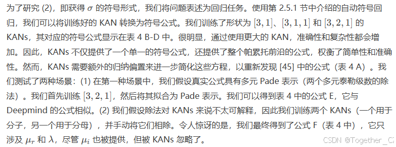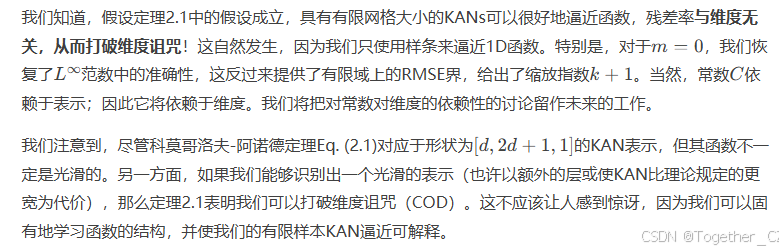 数学方面: 尽管我们已经对 KANs 进行了初步的数学分析(定理 2.1),但我们对它们的数学理解仍然非常有限。科莫哥洛夫-阿诺德表示定理在数学中已经得到了彻底的研究,但该定理对应于形状为 [n,2n+1,1] 的 KANs,这是 KANs 的一个非常受限的子类。我们在更深层 KANs 上的经验成功是否暗示了数学中的某些基本问题?一个吸引人的广义科莫哥洛夫-阿诺德定理可以定义“更深”的科莫哥洛夫-阿诺德表示,超越深度-2 的组合,并可能将激活函数的光滑性与深度联系起来。假设存在一些函数,它们不能在原始的(深度-2)科莫哥洛夫-阿诺德表示中光滑表示,但可能在深度-3 或更深层中光滑表示。我们能否使用这种“科莫哥洛夫-阿诺德深度”概念来表征函数类?