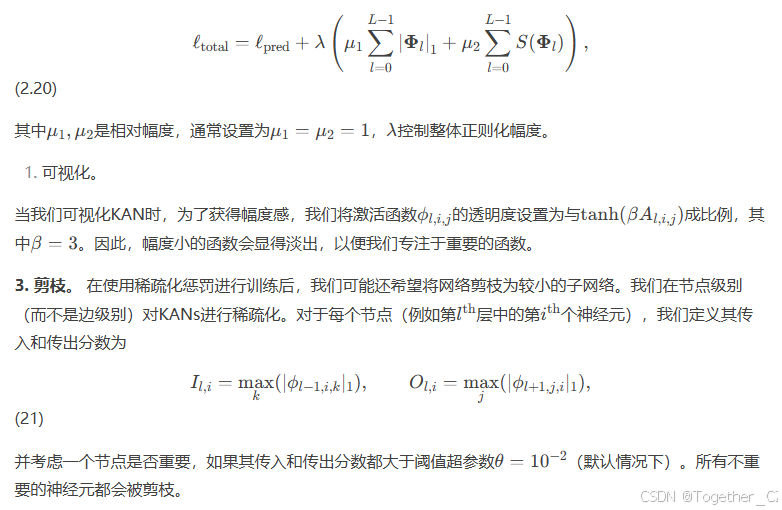 1. 稀疏化。 对于MLPs,线性权重的L1正则化用于促进稀疏性。KANs可以适应这一高级思想,但需要进行两个修改: