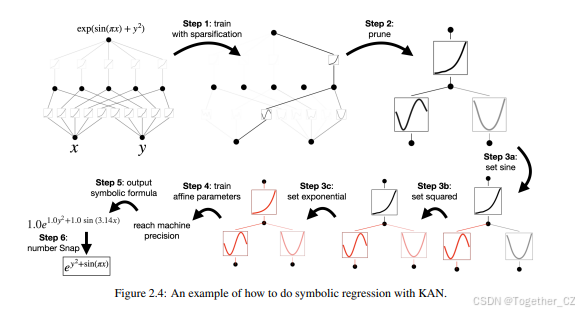 步骤4:进一步训练。 在符号化网络中的所有激活函数后,剩下的唯一参数是仿射参数。我们继续训练这些仿射参数,当我们看到损失下降到机器精度时,我们知道我们已经找到了正确的符号表达式。