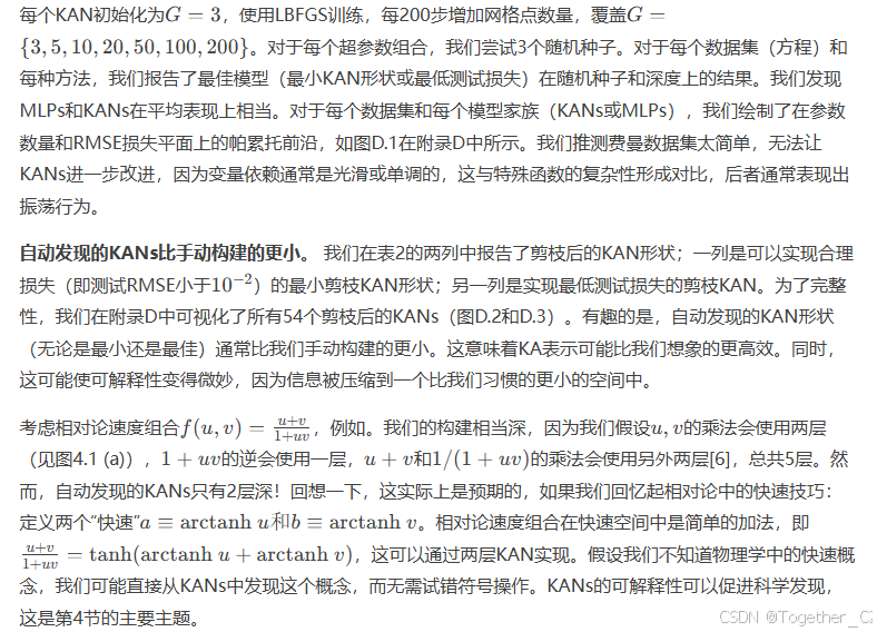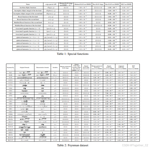 对于每个数据集和每个模型家族(KANs或MLPs),我们绘制帕累托前沿5,在(参数数量,RMSE)平面上,如图3.2所示。KANs的表现始终优于MLPs,即KANs可以在相同数量的参数下实现比MLPs更低的训练/测试损失。此外,我们报告了我们自动发现的特殊函数的紧凑KAN形状在表1中。一方面,解释这些紧凑表示的数学意义很有趣(我们在附录F中的图F.1和F.2中包含了KAN的图示)。另一方面,这些紧凑表示意味着将高维查找表分解为几个1D查找表的可能性,这可以潜在地节省大量内存,并且在推理时执行几次加法的开销(几乎可以忽略不计)。
