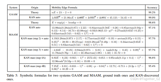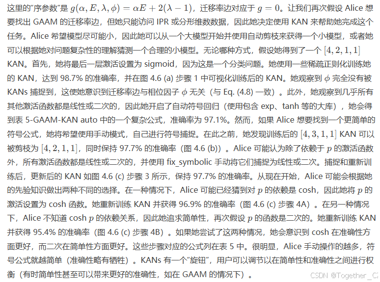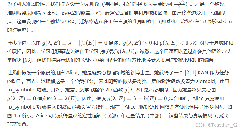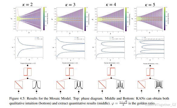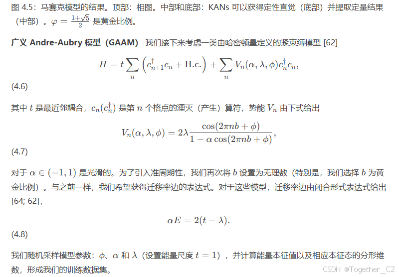 在这里,我们将 KANs 应用于从准周期紧束缚模型生成的数值数据,以提取其迁移率边。特别是,我们研究了三类模型:马赛克模型(MM)[63]、广义 Aubry-Andre 模型(GAAM)[62] 和修正的 Aubry-Andre 模型(MAAM)[60]。对于 MM,我们测试了 KAN 准确提取迁移率边作为能量的 1D 函数的能力。对于 GAAM,我们发现从 KAN 获得的公式与真实情况非常接近。对于更复杂的 MAAM,我们展示了该框架的符号可解释性的另一个示例。用户可以通过“协作”简化从 KANs 获得的复杂表达式(以及相应的符号公式),其中人类生成假设以获得更好的匹配(例如,假设某些激活函数的形式),之后 KANs 可以快速进行假设检验。