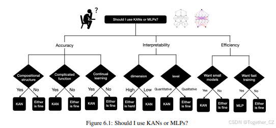 目前,KANs 的最大瓶颈在于其训练速度慢。在相同数量的参数下,KANs 通常比 MLPs 慢 10 倍。我们应该诚实地承认,我们并没有努力优化 KANs 的效率,因此我们认为 KANs 的慢训练更多是一个可以在未来改进的工程问题,而不是一个根本的限制。如果一个人想要快速训练模型,应该使用 MLPs。在其他情况下,KANs 应该与 MLPs 相当或更好,这使得它们值得尝试。图 6.1 中的决策树可以帮助决定何时使用 KAN。简而言之,如果你关心可解释性和/或准确性,并且慢训练不是主要问题,我们建议尝试 KANs,至少对于小规模的 AI + 科学问题。
