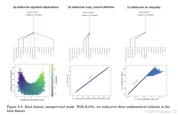 图 4.4:纽结数据集,无监督模式。通过 KANs,我们重新发现了纽结数据集中的三个数学关系。