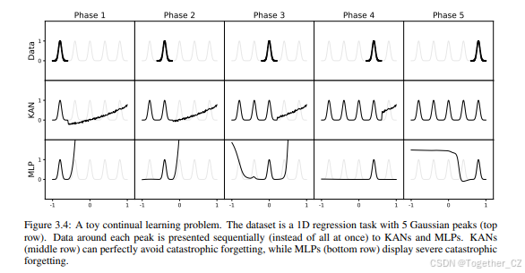 我们使用一个玩具示例来验证这一直觉。1D回归任务由5个高斯峰组成。每个峰周围的数据依次(而不是一次性)呈现给KANs和MLPs,如图3.4顶部所示。KAN和MLP在每个训练阶段后的预测显示在中间和底部行。正如预期的那样,KAN只重塑当前阶段存在数据的区域,而之前的区域保持不变。相比之下,MLPs在看到新数据样本后重塑整个区域,导致灾难性遗忘。