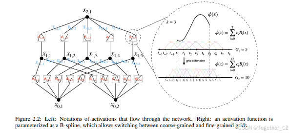 如图2所示,左:通过网络流动的激活符号。右:激活函数被参数化为B样条,允许在粗粒度和细粒度网格之间切换。