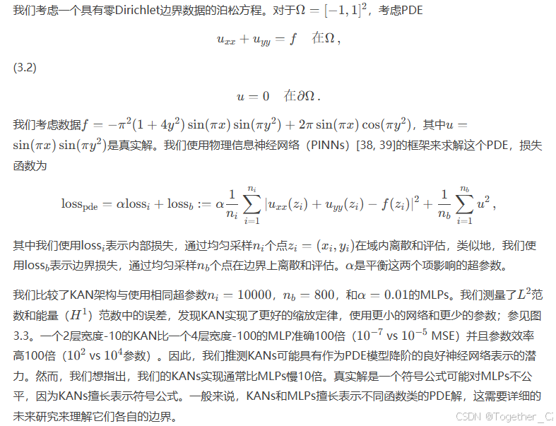 物理信息神经网络(PINNs)和物理信息神经算子(PINOs)。 在第 3.4 节中,我们展示了 KANs 可以取代使用 MLPs 施加 PDE 损失的范式来求解 PDEs。我们参考 Deep Ritz 方法 [100]、PINNs [38, 39, 101] 用于 PDE 求解,以及傅里叶神经算子 [102]、PINOs [103, 104, 105]、DeepONet [106] 用于学习解映射的算子学习方法。在所有上述网络中,用 KANs 取代 MLPs 具有潜力。