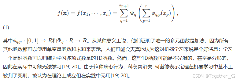 弗拉基米尔·阿诺德和安德烈·科莫哥洛夫证明了如果f是有界域上的多元连续函数,那么f可以写成有限个单变量连续函数和加法二元运算的组合。更具体地说,对于光滑的f:[0,1]^n→R,