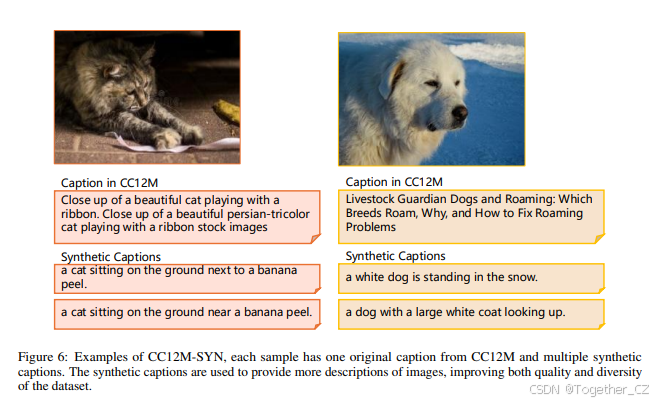 用于训练CLIP模型的图像-文本数据集大多从互联网收集,包含固有的噪声样本,这些样本的描述性不够。在使用小规模数据集时,数据样本的多样性和质量变得更加重要。添加合成标题是一种廉价但有效的方法,可以提高多样性和质量。我们采用广泛使用的数据集CC12M,并使用coca为数据集中的每个图像生成多个合成标题,获得CC12M-SYN。图6展示了CC12M-SYN中带有合成标题的一些示例。在训练期间,我们从原始和合成标题的集合中随机选择一个文本。结果,CC12M-SYN中的一个样本由一张图像和一个合成或原始标题组成。