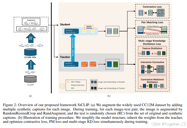 图2:我们提出的SiCLIP框架概述。(a) 我们通过为每张图像添加多个合成标题来增强广泛使用的CC12M数据集。在训练过程中,对于每个图像-文本对,图像通过RandomResizedCrop和RandAugment进行增强,文本则从原始和合成标题集合中随机选择(RC)。(b) 训练过程的示意图。我们简化了模型结构,继承了教师的权重,并在训练过程中同时优化对比损失、PM损失和多阶段知识蒸馏(KD)损失。