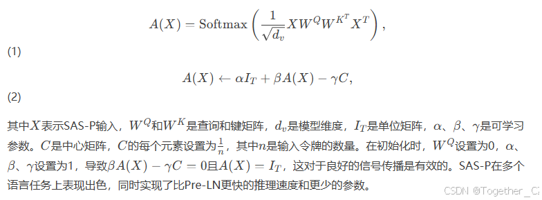 图3的右侧展示了SAS-P(He和Hofmann,2024),这是一种简化的并行Transformer块,消除了跳跃连接以及值和投影参数。它使用形状注意力作为其令牌混合器,以防止在去除跳跃连接后信号退化,使注意力矩阵更类似于身份矩阵,以保持良好的信号传播。形状注意力的注意力矩阵由以下公式给出: