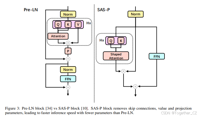 我们首先减少了每个Pre-LN块中跳跃连接的参数。这些连接的存在导致了内存访问和推理速度的瓶颈,因此轻量级的基于MHSA的块设计变得至关重要。此外,研究表明,前馈层可以集成到注意力模块中,而不会降低Transformer层的性能。