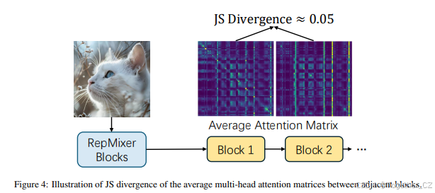 为了进一步简化模型结构,我们评估了相邻MHSA块之间的Jensen-Shannon(JS)散度(见图4)。低JS散度意味着可以在这些矩阵之间使用权重共享而不会降低性能。因此,在训练期间应用KD之前,我们的“学生”模型将所有Pre-LN块替换为SAS-P块,并在这些块之间应用权重共享。结果,我们的模型的图像编码器比MobileCLIP-S0减少了约14%的参数,仅为OpenAI-B/16的11%。